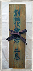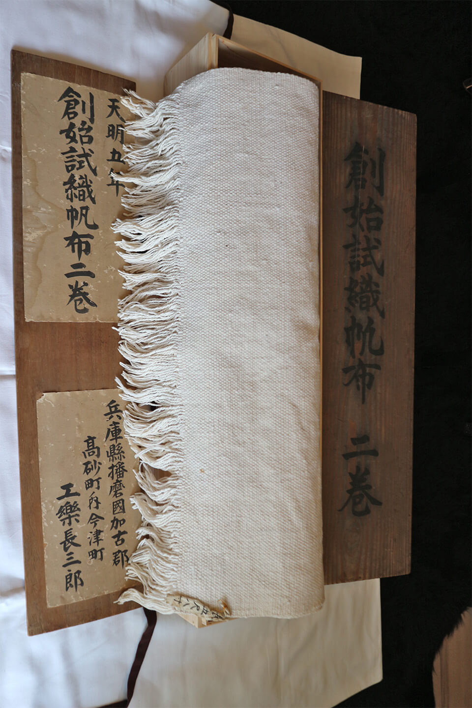 右の写真は、下の写真は、工樂松右衛門が創製した当時の帆布そのものですが、これが北前船に使用されていた帆布の松右衛門が制作した試織です。工楽家に保存されている初代松右衛門が創製した当時の松右衛門帆のオリジナルで、工楽松右衛門旧宅に展示されているバッグメーカー製作の帆布とは綿糸の太さもサイズも全く違います。本当の松右衛門帆には、発明に値する独特の工夫がなされています。それは帆の中央部と両端の部分の織り方を変えているところにあります。この工夫がないものは松右衛門帆ではありません。